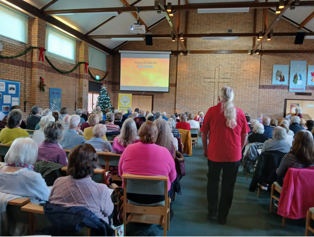 Then the entertainment commenced. Dave read ‘Be kind to your Turkeys this Christmas’ before Eric led the Ukulele band with some admirable singing as they played a variety of favourites including gospel songs, rock n roll classics and then….